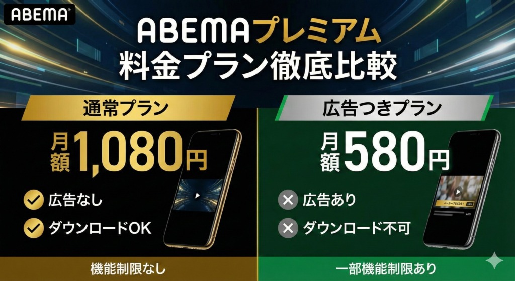新しく登場した「広告つきABEMAプレミアム」は通常プランと何が違う?月額580円の安さは魅力ですが、ダウンロード機能の有無や広告の入り方など、知っておくべき制限があります。通常プランとの違い、メリット・デメリット、登録・解約方法までを徹底解説します。 -