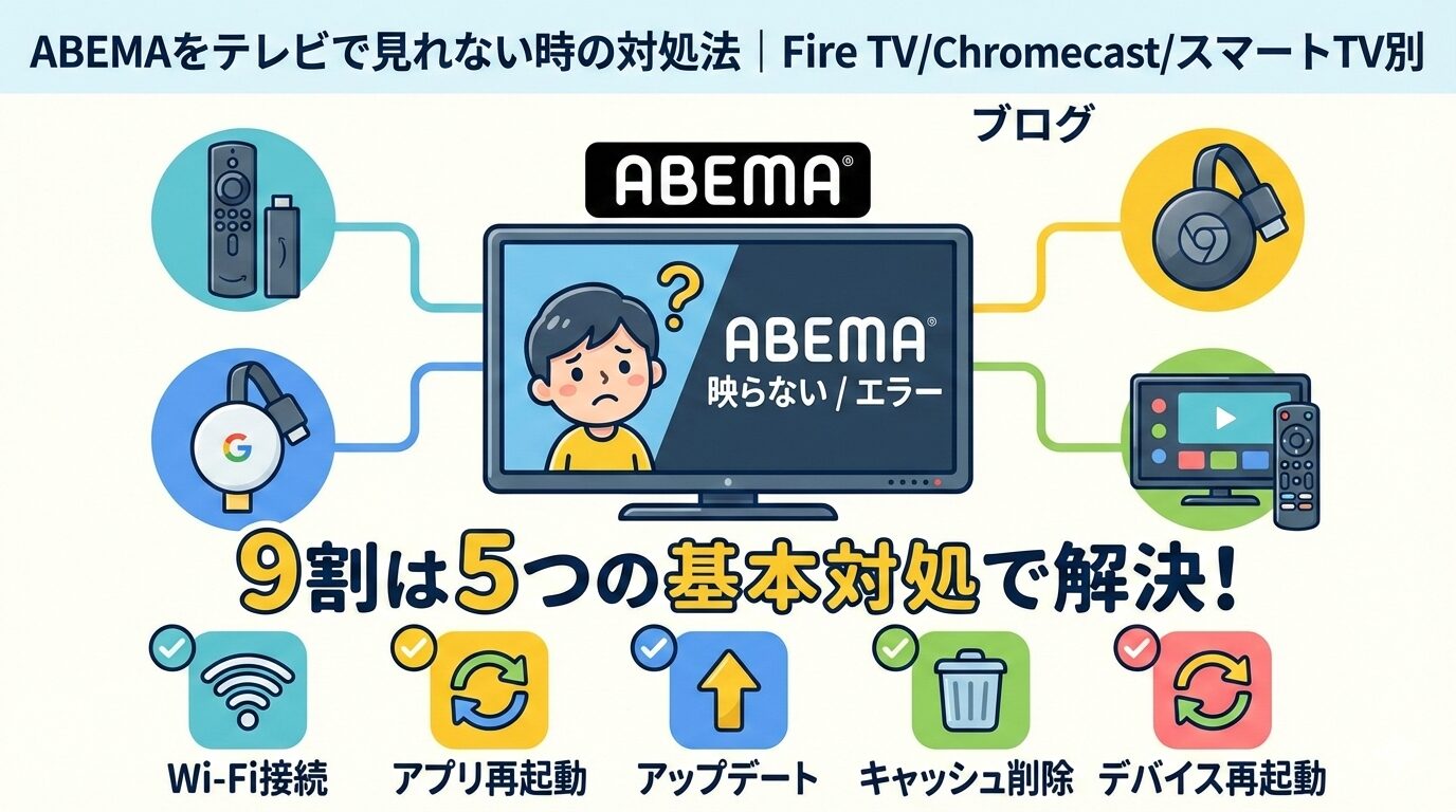 ABEMAがテレビで見れないときの対処法を、Fire TV Stick・Chromecast・スマートテレビのデバイス別に解説しました。トラブルの9割は「Wi-Fi接続の確認」「アプリの再起動」「アプリのアップデート」「キャッシュの削除」「デバイスの再起動」の5つの基本ステップで解決できます。エラーメッセージが表示される場合はメッセージ別の対処法を、映像が止まる・画質が悪い場合は通信環境の改善を試してください。