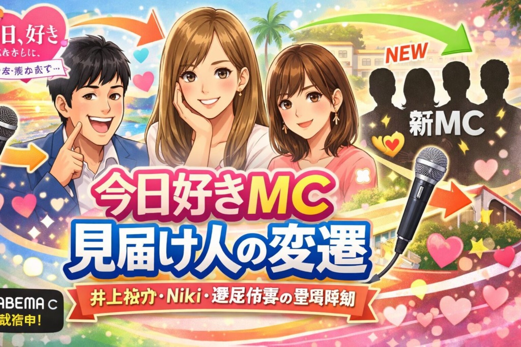 「今日、好きになりました。」(今日好き)の恋愛見届け人(MC)は、番組の魅力を語るうえで欠かせない存在です。初期のNikiから、井上裕介・鷲尾伶菜の黄金トリオ時代、そして現在の4人体制まで、見届け人の変遷と各メンバーの登場時期を時系列で詳しくま... -