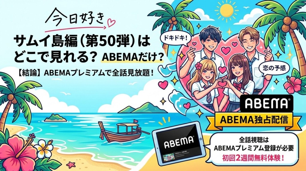 「今日好きサムイ島編を見たいけど、どこで配信されてるの?」「無料で見る方法はあるの?」と気になっている方へ。結論から言うと、今日好きサムイ島編(第50弾)はABEMAで独占配信されており、全話視聴するにはABEMAプレミアム(月額960円・税込)への登... -
