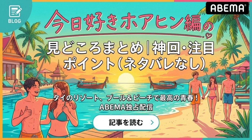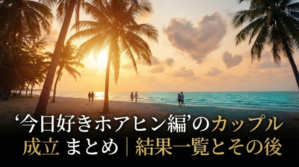 『今日、好きになりました。ホアヒン編』(第63弾)は、タイのリゾート地ホアヒンを舞台に男女10人の高校生が恋を探す恋愛リアリティーショーです。結論からお伝えすると、最終回の告白ではカップル成立0組という衝撃の結末となりました。ここでは全告白の... -