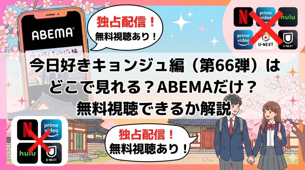 「今日好きキョンジュ編(第66弾)を見たいけど、どこで配信しているの?」「ABEMAでしか見れないの?無料で見る方法はある?」そんな疑問にお答えします。結論から言うと、今日好きキョンジュ編はABEMAの独占配信です。他の動画配信サービスでは視聴でき... -