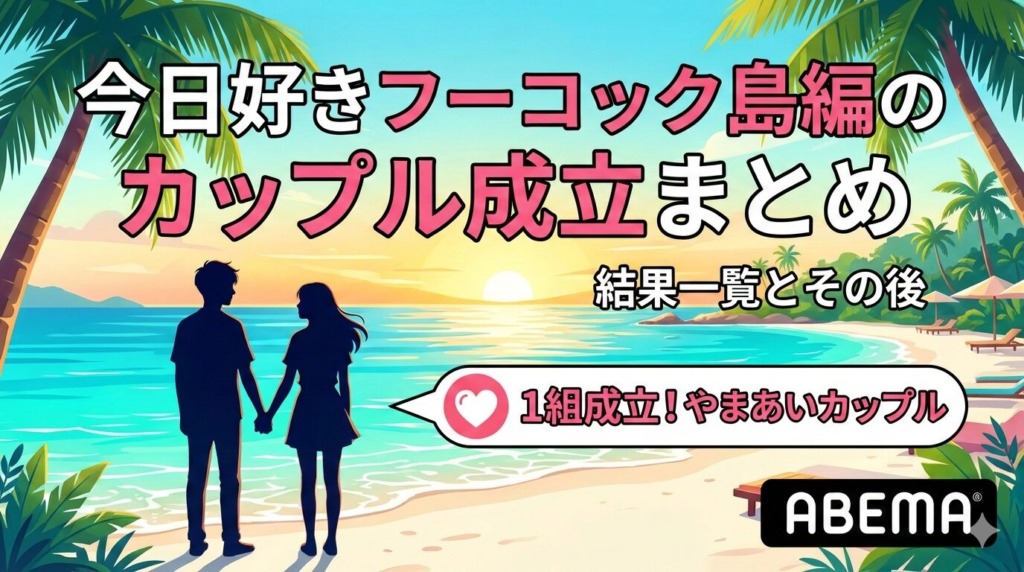 「今日好きフーコック島編ってどんなカップルが成立したの?」「やまあいカップルのその後は?」と気になっている方へ。フーコック島編で成立したカップルはやまと(須藤大和)×あいさ(細川愛沙)の"やまあいカップル"1組のみ。約3年間交際を続けましたが... -