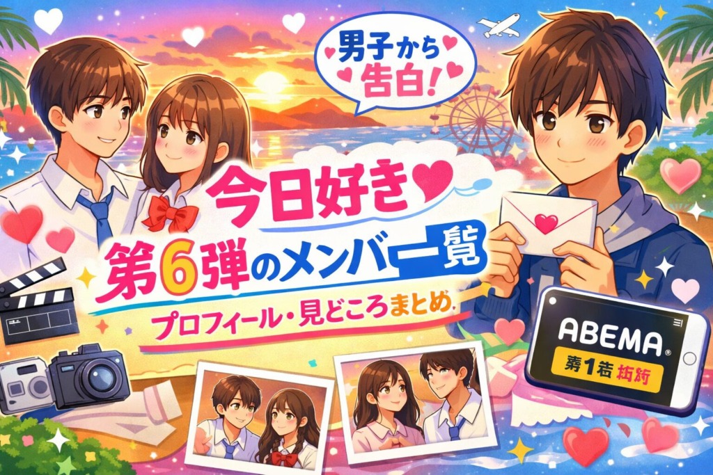『今日、好きになりました。第6弾』は、シリーズ初の「男子から告白」ルールが導入された歴史的なシーズンです。全4話がABEMAで配信中で、第1話は無料で視聴可能。2話以降はABEMAプレミアムに加入すれば見放題で楽しめます。この記事では出演メンバー全員... -
