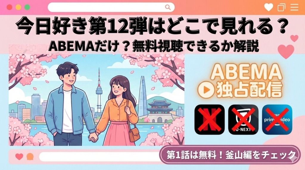 「今日、好きになりました。」第12弾(釜山編)を見たい方に結論からお伝えします。第12弾はABEMA独占配信で、Netflix・U-NEXT・Amazonプライムビデオなど他の動画配信サービスでは視聴できません。第1話は無料で見られますが、第2話以降はABEMAプレミアム... -