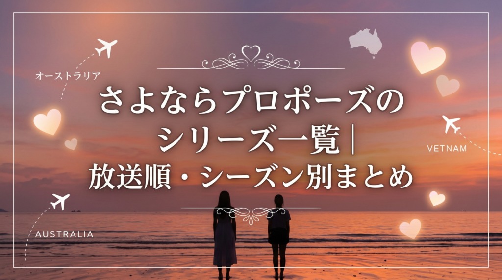 【さよならプロポーズの見る順番(放送順)と初心者におすすめの入り口|全シリーズ一覧&どこから見るべきかを徹底ガイド【2026年最新】】「さよならプロポーズ(さよプロ)」は、結婚に踏み切れないカップルが7日間の海外旅行を経て"結婚"か"別れ"を決断... -