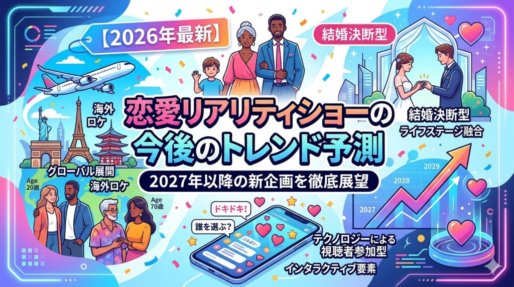 【恋愛リアリティショーの今後のトレンド予測|2027年以降の新企画を徹底展望【2026年最新】】恋愛リアリティショー(恋リア)は2017年の「恋リア元年」から進化を続け、2027年以降はさらに大きな変革期を迎えると予測されています。年齢層の拡大、海外ロ...