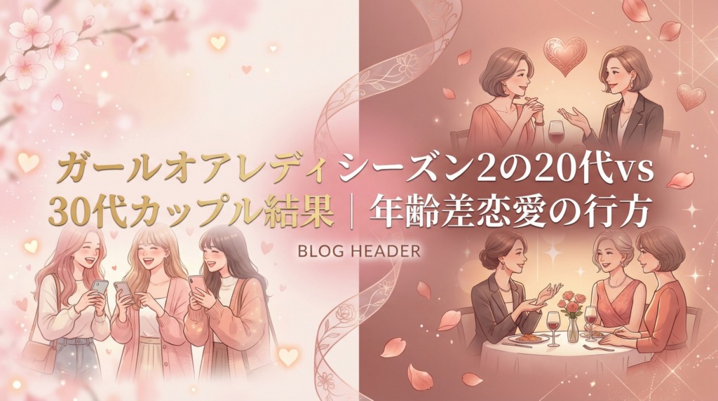 【ガールオアレディシーズン2の20代vs30代カップル結果|年齢差恋愛の行方を徹底まとめ】「ガールオアレディ シーズン2」は、20代ガールと30代レディが"結婚を見据えた恋愛"に本気で挑んだ婚活リアリティーショーです。最終回では3組のカップルが成立し、... -
