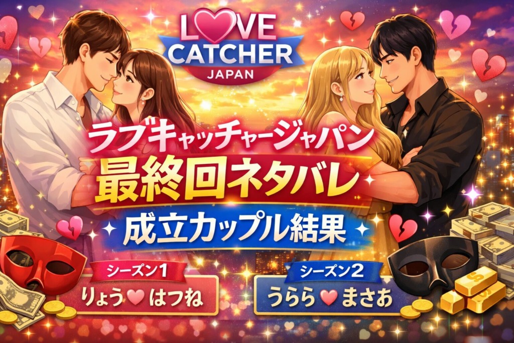 ラブキャッチャージャパンの最終回で成立したカップルは、シーズン1が「りょう&はつね」の1組、シーズン2が「うらら&まさお」の1組です。両シーズンとも衝撃的なマネーキャッチャーの正体が明らかになり、視聴者を驚かせました。この記事では全メンバー... -