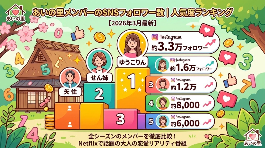 【あいの里メンバーのSNSフォロワー数|人気度ランキング【2026年3月最新】】「あいの里」メンバーの中で、誰が一番人気なのか気になりませんか?結論から言うと、シーズン1で圧倒的な人気を誇るのはゆうこりん(約3.3万フォロワー)で、シーズン2ではせん...