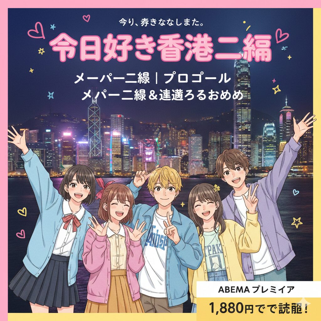 今日好き香港ディズニーランド編(第18弾)は、「のあのあ」コンビの切ない恋模様、シリーズ史上初の全員不成立という衝撃の結末、そして夢の国・香港ディズニーランドという最高のロケーションが揃った、今日好きファンなら必見のシーズンです。全5話と視聴しやすいボリュームで、ABEMAプレミアムなら全話見放題。初回2週間の無料体験を使えば、実質0円で楽しむことができます。