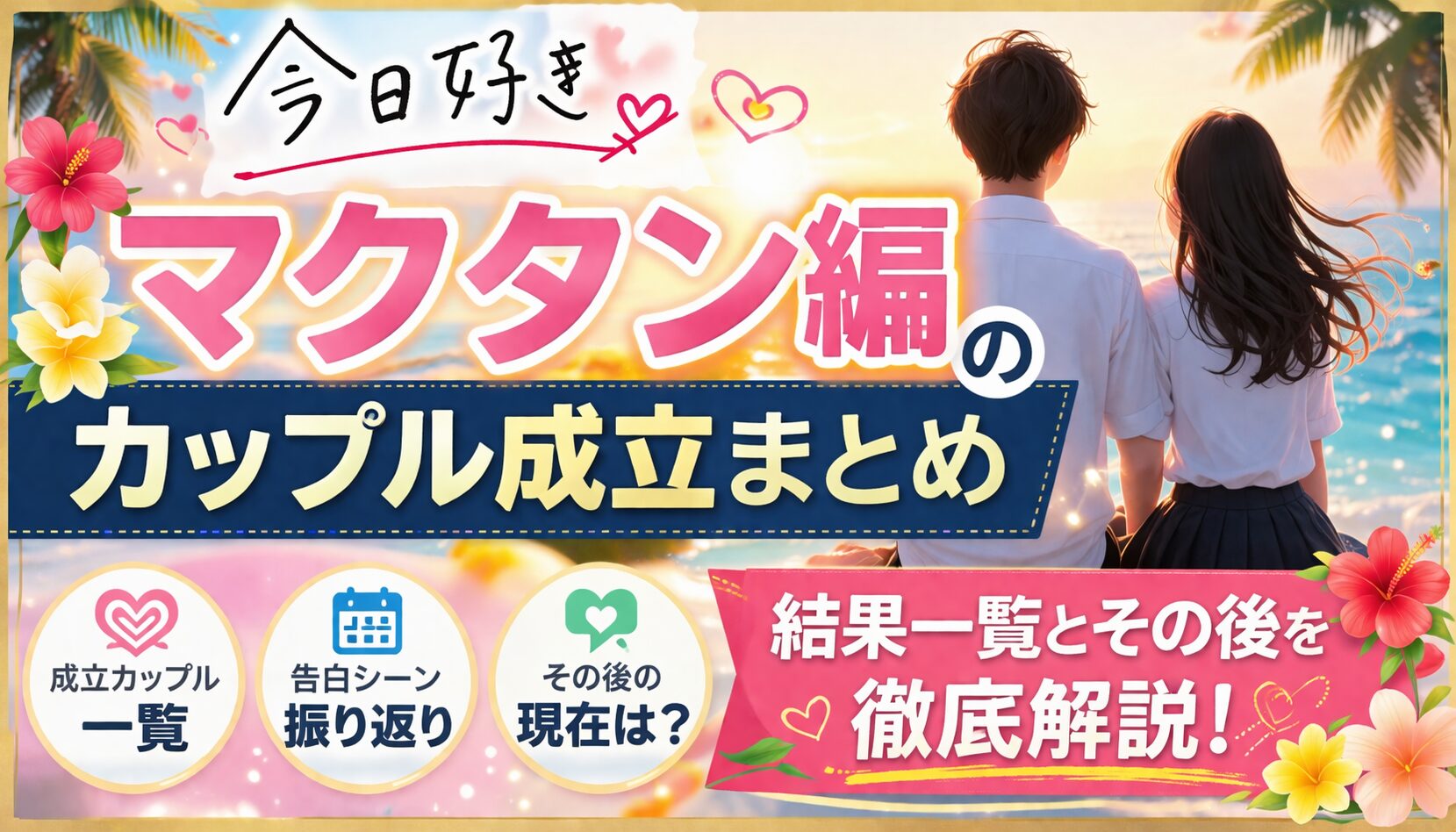 『今日、好きになりました。マクタン編』の最終回(2025年6月9日配信)で成立したカップルは、かなと(河村叶翔)×りのん(相塲星音)の「かなりの」カップル1組のみです。女子全員から想いを寄せられたはるとは誰にも告白せず、視聴者に大きな衝撃を与えました。この記事では、全メンバーの告白結果一覧から成立カップルのその後(2026年2月最新)まで完全網羅します。