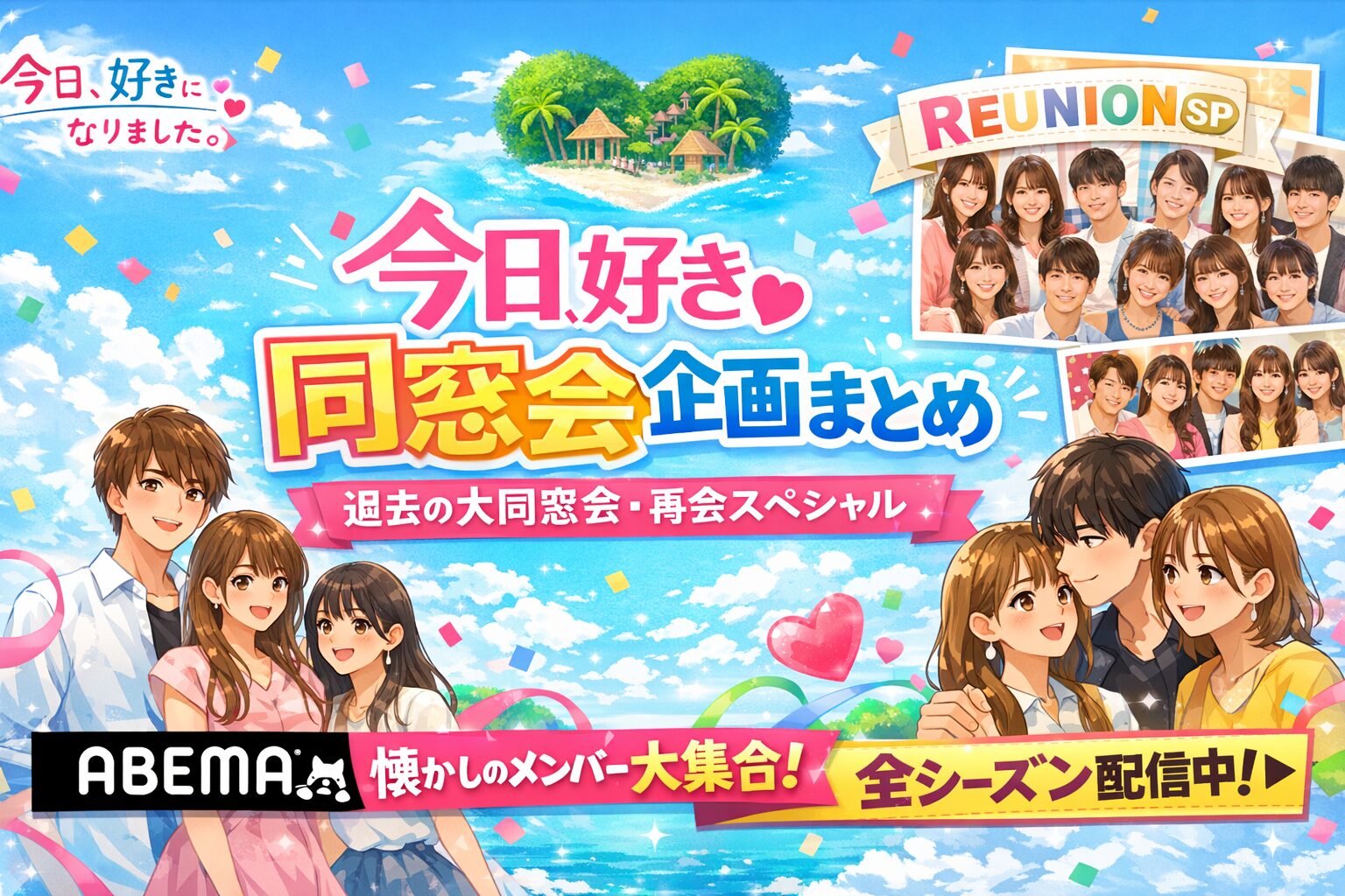 「今日、好きになりました。」(今日好き)の同窓会企画は、歴代メンバーが再集結して旅の裏話や本音を語り合う特別番組です。2018年の「大同窓会SP」から2023年の50シーズン記念企画まで、すべての同窓会・再会スペシャルをまとめました。ABEMAプレミアムなら全シーズンの見逃し配信を含めていつでも視聴できます。