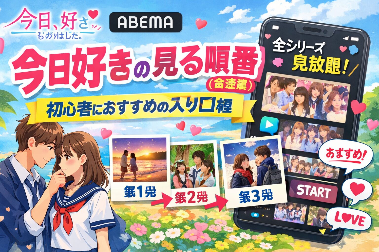『今日、好きになりました。』(通称:今日好き)を見たいけど、シリーズが多すぎてどこから見ればいいかわからない——。そんな初心者の方に向けて、全シリーズの放送順一覧と、最初に見るべきおすすめの「入り口編」を2026年2月最新の情報でまとめました。今日好きはABEMA独占配信で、ABEMAプレミアムなら全シーズン見放題です。