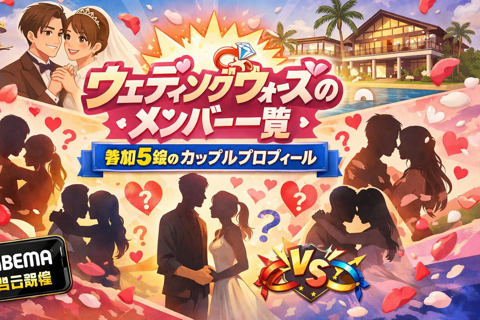「ウェディングウォーズに出ているカップルって誰?」「メンバーのプロフィールが知りたい!」そんな方に向けて、本記事ではABEMAの婚前合宿サバイバル番組『ウェディングウォーズ』に参加した全8組のカップルのプロフィールや見どころ、番組の魅力をまとめてご紹介します。